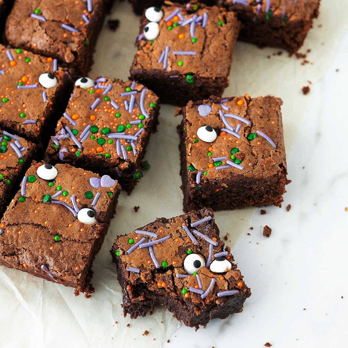 Extremely easy, one bowl brownies with Halloween sprinkles and candy eyes.